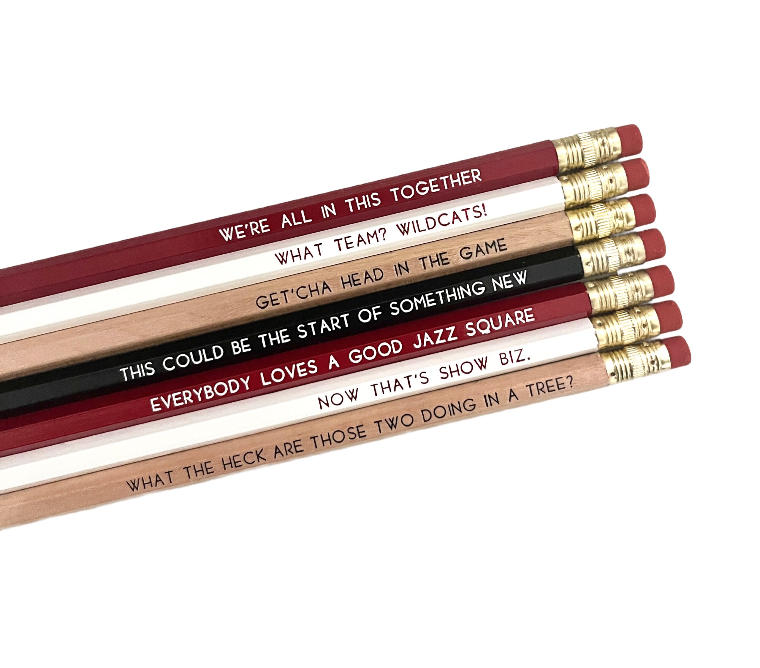 For it’s 20th anniversary, celebrate High School Musical with this seven-pencil set featuring quotes and lyrics from the movie, stamped in black, white, and red foil.
