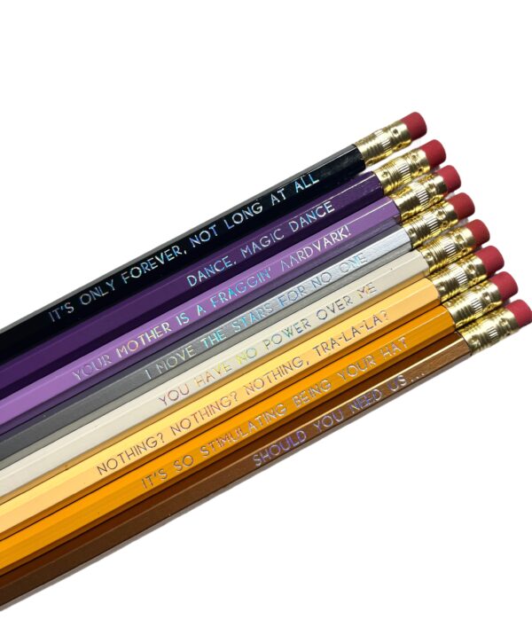 Eight pencils featuring quotes from the 80s David Bowie-led cult classic stamped in iridescent foil.